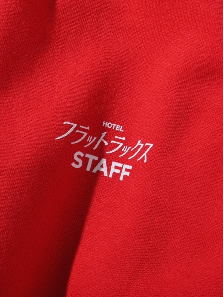「マニアの間で密かな話題のラブホテル、HOTEL フラットラックスのスタッフ用の制服(非売品)が流出!? という設定。 フロントには “STAFF” の文字、メルカリでプレ値はつかないだろうけど、これを着たらお風呂掃除スキルは大幅アップするかも。」