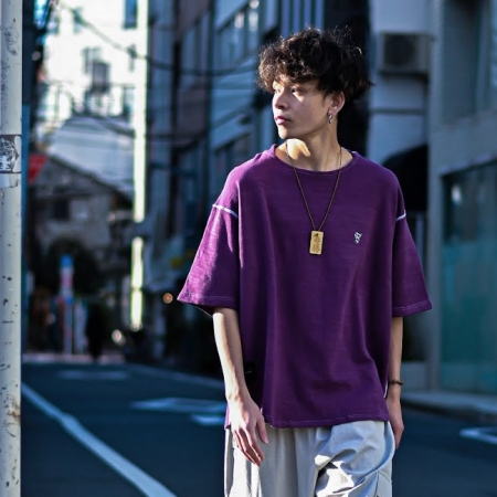 「想像してみてほしい。 アラジンの魔法のじゅうたんの上で感じる夜の空と風。 誰もいない露天の温泉に浸かる瞬間。 巨乳の谷間に顔をうずめる無垢さ。 快晴の高原で飲む生ビール。 Mid Ss-Hybridneck "pile" はだいたいそんな感じ。 肌触り最高のタオル地、ボートネックとクルーネックを組み合わせた独創的な首元、一度着ると病みつきになるオリジナルビッグシルエット。 ノンストレス。 着心地の向こう側。 着て街に出て、自然とヨダレが垂れてても知りません。 Made in Japan。」