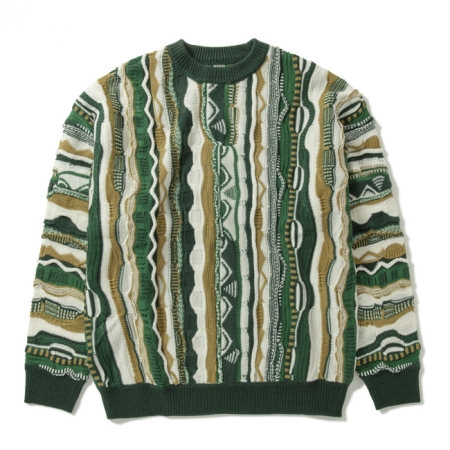 90年代のヒップホップシーンにおいて、ビギー等アーティストの着用により一気に注目された3Dニット。近年ビンテージ市場でも COOGI 社のニットを中心に人気が再燃しています。3Dニットは、特殊かつ複雑な編みから表現される高いデザイン性が特徴的であり、立体構造のジャガードはニッティングを再現するのに高度な技術が必要とされています。本製品はアクリル糸を採用する事で、軽量化とイージーケアを実現。90年代のゆったりしたサイズ感と袖のダボつきのあるシルエットは、男女問わず様々なアイテムとのコーディネートが可能なセーターです。