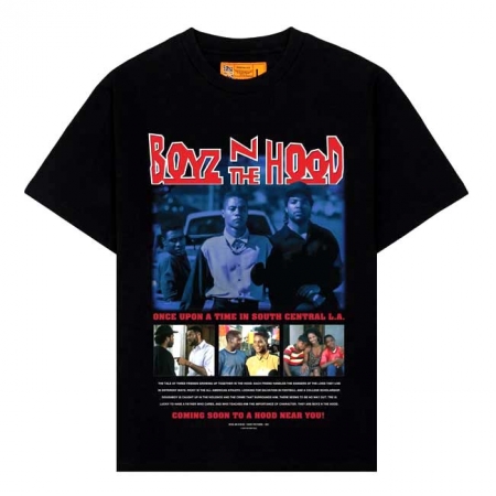 BOYZ N THE HOOD のメインロゴと、映画のシーンのイメージに囲まれたボーイズ・アンド・ザ・フッドの象徴的なポスターが描かれています。ウォッシュのかかったビンテージ風な仕上げ加工。