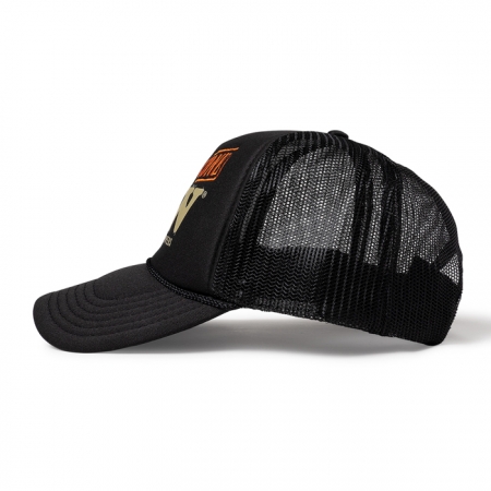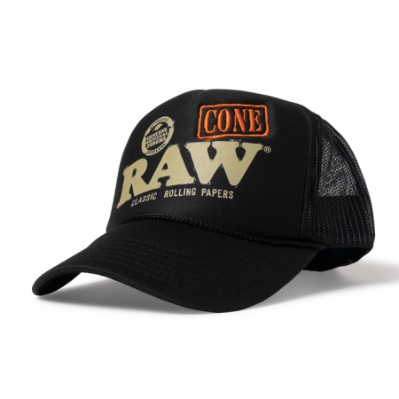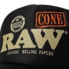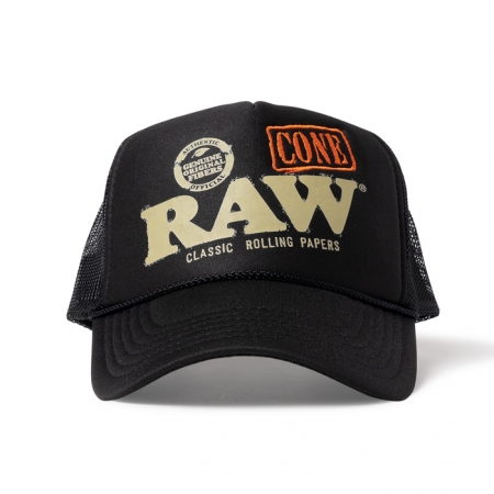 自然由来の原料にこだわるローリングペーパーメーカー” RAW” とのコラボレーションアイテム。ローリングペーパーと並ぶ RAW の人気喫煙具、”RAW CONE” のロゴを落とし込んだデザインで、CONE の迫力有るパッケージをプリントと刺繍で表現しています。ベーシックなトラッカータイプで、ウレタンフロントに後部はメッシュ素材となっています。