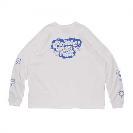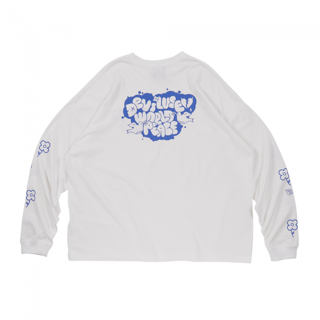 "World Peace" メッセージグラフィック L/S T シャツ。オーバーサイズフィットの程よい厚みの生地感で柔らかく着心地の良いロングスリーブTシャツです。男女ともにおすすめです。