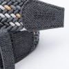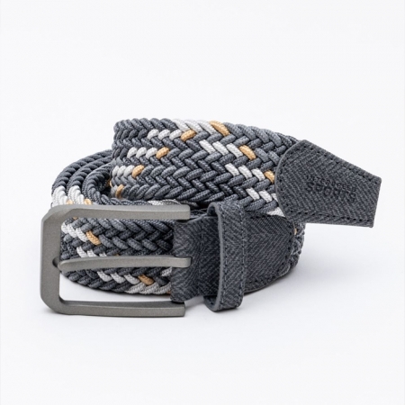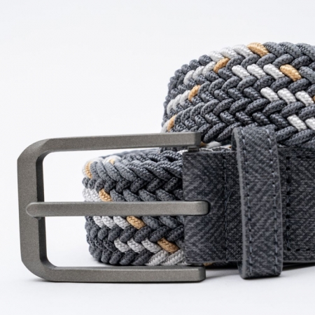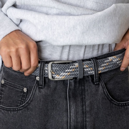 高い伸縮性とカラーリングが特徴の編み込みベルトです。体型を問わずにフィットする伸縮タイプの全長110cmのベルトで、耐久性/摩耗性にも優れた PU 素材の細いバンドをメッシュ状に編み込んで成形されています。ベルトホールの無い、どの位置でも固定出来る仕様で、本体はグレーxイエローのカラーリング、ベルトエンドには SPORTS の刻印が入っています。