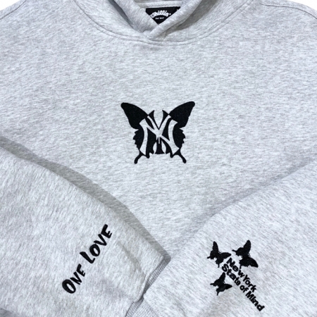アイコンである バタフライと NY モノグラムのミックスロゴをフロントに、NY STATE OF MIND と ONE LOVE の文字を両袖に刺繍。100% コットン12オンス 裏起毛のヘビーウェイト ボディのスウェットパンツ。同デザインのパンツとセットアップコーデが可能です。