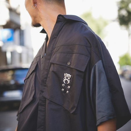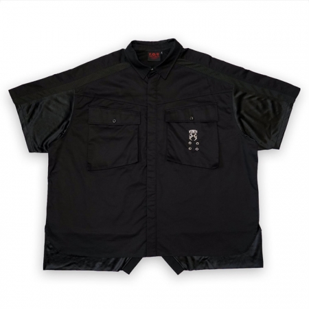 異素材のコントラストがストリートに映える、唯一無二の再構築シャツ。素材違いのブラックカラーボディに、洗練された再構築デザインが施され、シンプルでありながら見る者を引きつける印象を与えます。