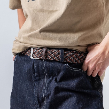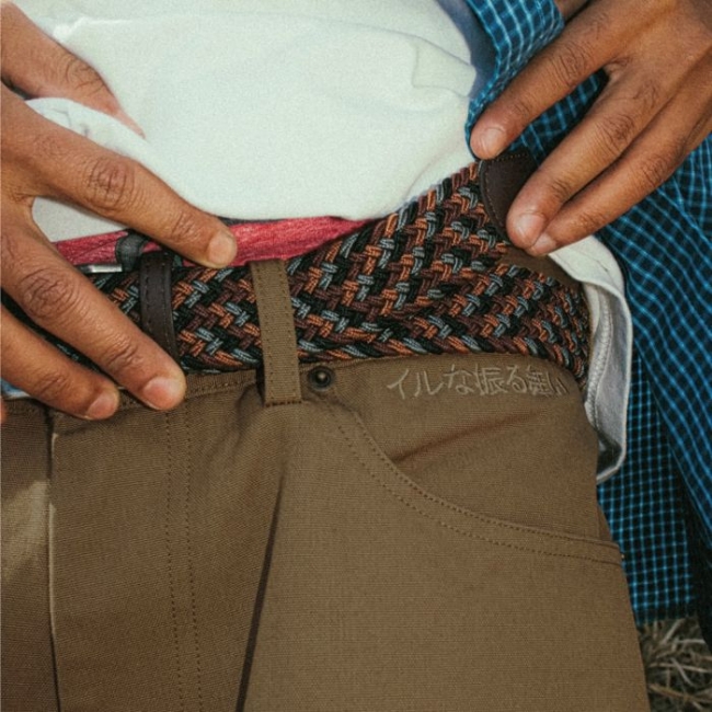 「モザイクのような多色の編みのストレッチメッシュベルト。 テンションがかかるとググッと伸びるので、この上なくストレスフリー。 スケートやダンスなど身体を動かす時はもちろん、普通にイスに座るだけで体感できる気持ちよさ。 茶色ベースでグレーと黒が入ったearth、黒と濃紺にグレーとオリーブが混ざったblack。 140cmと少し長めなので、垂らして使うのもアリ。 再利用可能な防水のパッケージに入りなので、小物入れなどお出かけのお供にどうぞ。」
