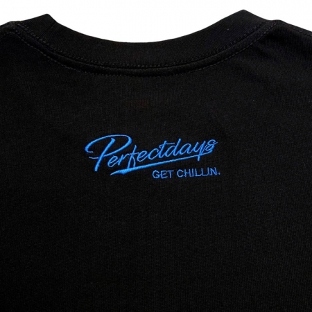 フロントにビッグサイズのロゴと バタフライのグラフィックをプリント。袖に ONE LOVE の刺繍、ネック後ろに Perfectdays GET CHILLIN の刺繍。