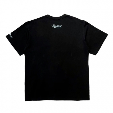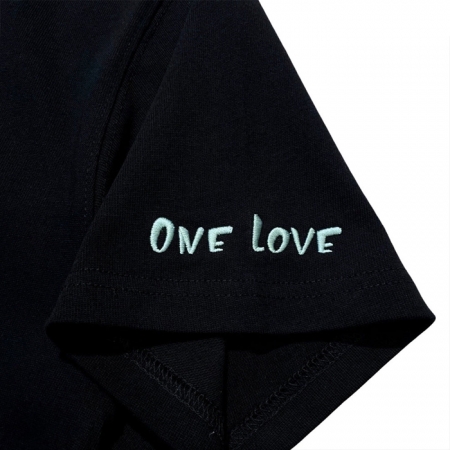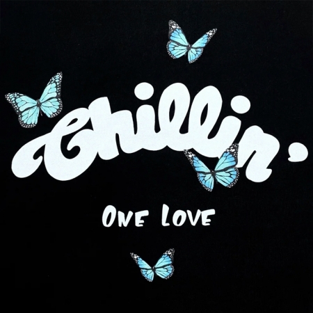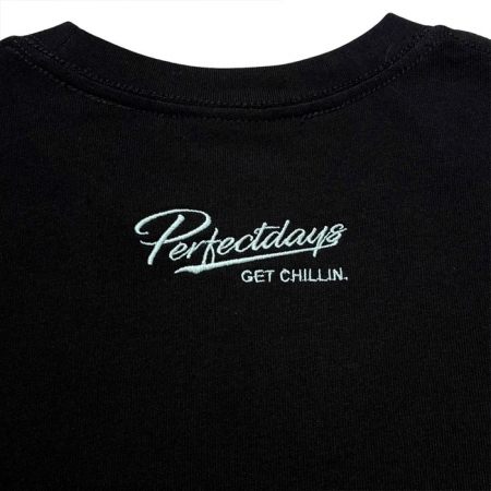 フロントにビッグサイズのロゴと バタフライのグラフィックをプリント。袖に ONE LOVE の刺繍、ネック後ろに Perfectdays GET CHILLIN の刺繍。