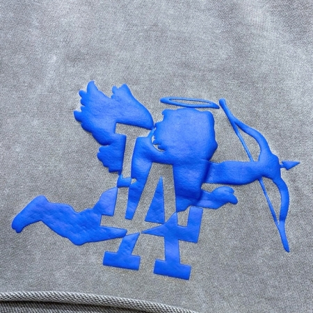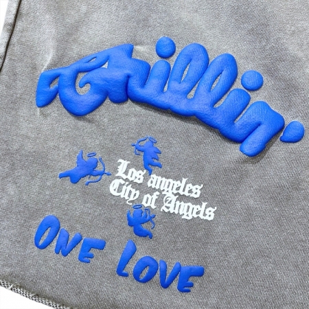 裾がカットオフされたピグメントダイのスウェットショーツ。アイコンである エンジェルと LAモノグラムのミックスロゴが左フロントに、Chillin のスクリプトロゴ や ONELOVE の集合グラフィックが右フロントにフロッキーで立体プリントされています。100% コットン裏毛のヘビーウェイト ボディ。