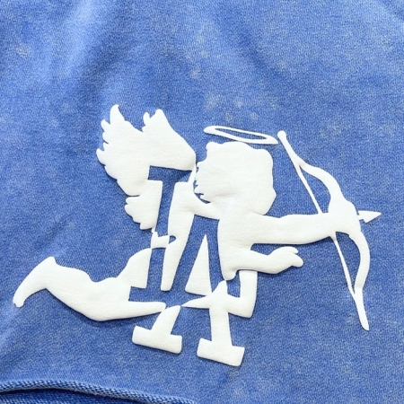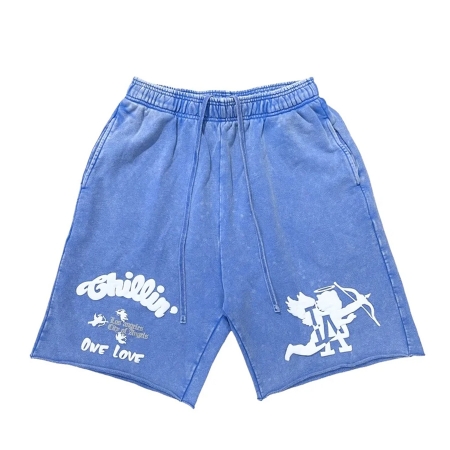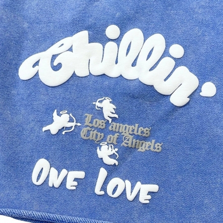 裾がカットオフされたピグメントダイのスウェットショーツ。アイコンである エンジェルと LAモノグラムのミックスロゴが左フロントに、Chillin のスクリプトロゴ や ONELOVE の集合グラフィックが右フロントにフロッキーで立体プリントされています。100% コットン裏毛のヘビーウェイト ボディ。
