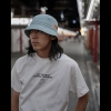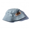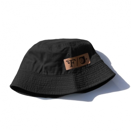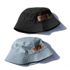 「一般的なバケットハットよりツバが寝ていて広がっておらず、より目深く被れる今っぽいシルエット。 サイドに縫い付けられた革パッチには JAIROとFLATLUX のロゴがレーザー加工で刻印されている。」
