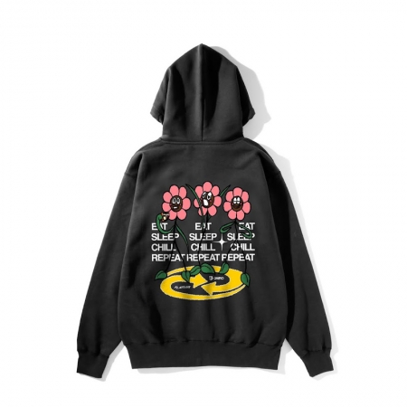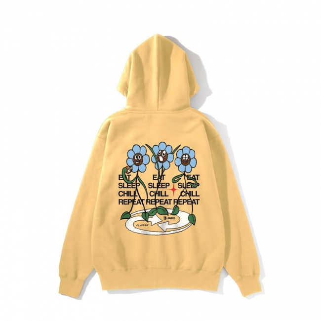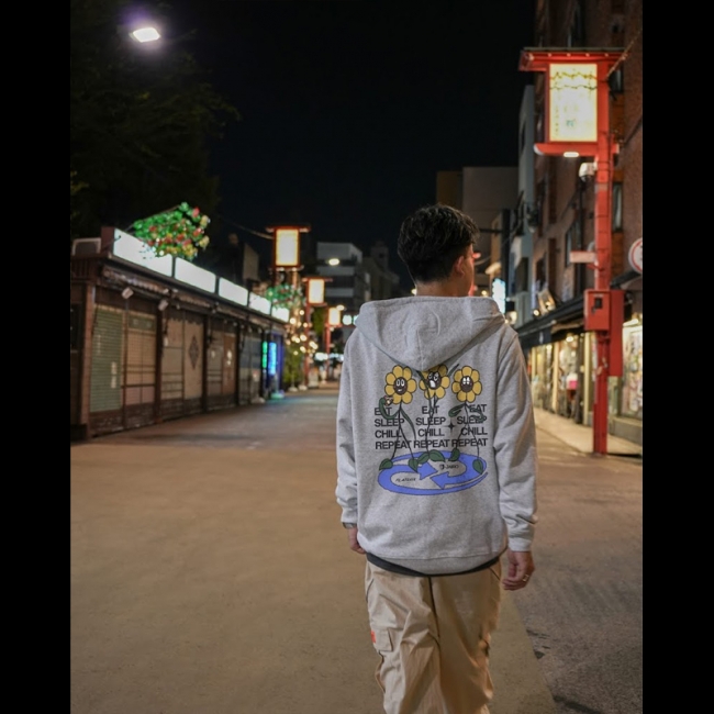 「軽いのにペラくない、薄いのにシルエットがキレイ、1枚あると心強い、ロングシーズン使える薄手の裏パイル(裏毛)のジップパーカ。 Eat, Sleep, Chill, Repeat,これを羽織ってずっとそんな生活していたいですねぇ。 Silly なフラワーちゃんたちは JAIRO のロゴをデザインした Sdanley によるグラフィック。」