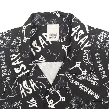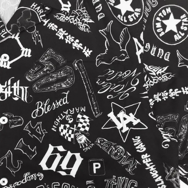古今東西のラッパーの印象的なタトゥーをコラージュ、シワになりにくいポリエステル100%の生地にプリントした半袖シャツです。