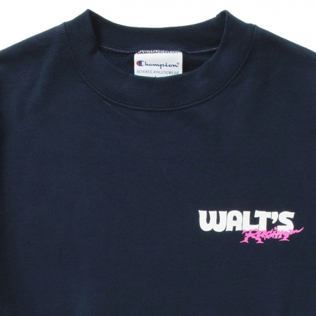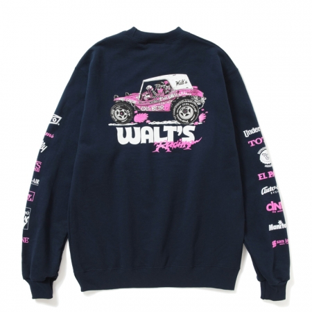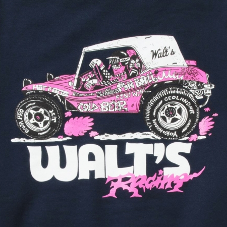 Walt's BAR オーナー Jeff の親友である Jay Howell a.k.a punks git cut によるデザイン。メキシコ北西部の baja california で開催される砂漠地帯のレース ”Baja 1000 ”に Walt's のチームとして参加したときのチームシャツのアートデザインとなります。両袖にチームのスポンサーとなった企業のロゴがずらりとプリントされています。