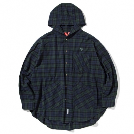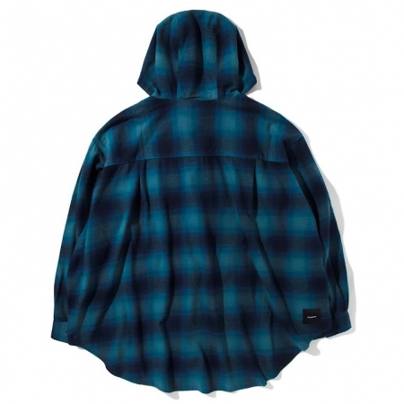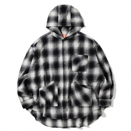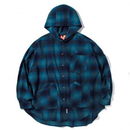 暑い秋に活躍する超ワイド&ロングでポンチョ風のフード付きネルシャツ。シャツなんだけどジャケットっぽいポケットが付いて、ライトアウターっぽくTシャツやスエットの上に羽織ってもいいし、ジャケットの中に着てもいいし、色々遊べます。」サイズ M 身幅 83cm 着丈 83cm サイズ L 身幅 88cm 着丈 88cm