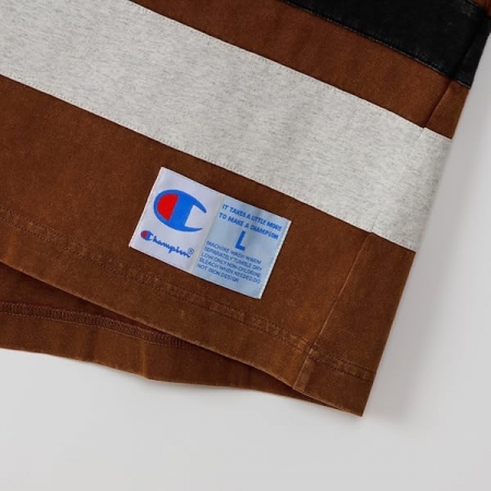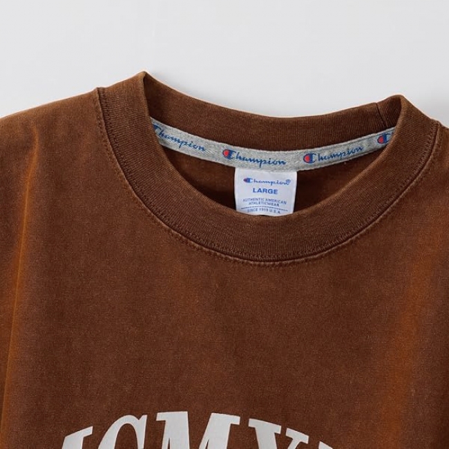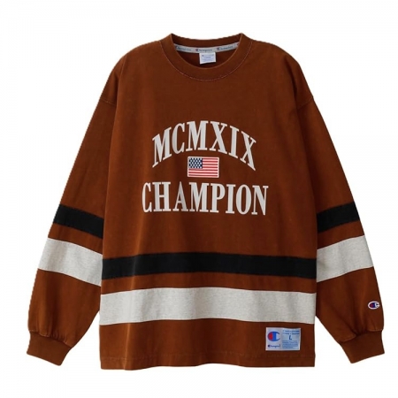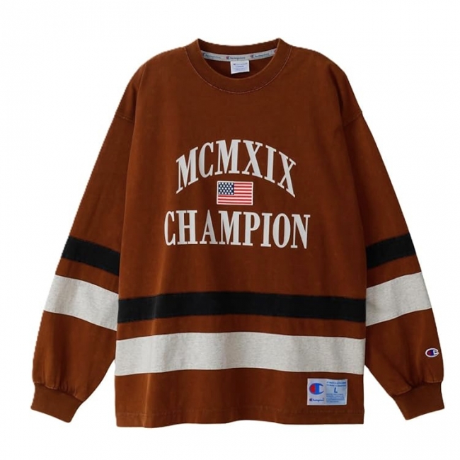 環境に配慮して生産されたサステナブルなアメリカ綿を100%使用した、ドライな着心地のロングスリーブTシャツです。ゆったりとした身幅、肩幅、袖幅に対し、着丈をやや短めにして着用時のシルエットのバランスをとった、ACTION STYLE(アクションスタイル)独自のサイジングのリラックスフィット。ユーズド感を演出する加工によって、長く愛用してきたようなムラのある色合いを出しています。袖と身頃下に、共地の切り替えデザイン。胸のグラフィックはChampion®(チャンピオン)の創設年である1919年をローマ数字で表現した「MCMXIX」と「CHAMPION」を2段に組んだラバープリントで、文字と文字の間には星条旗のワッペンを付けています。裾にはジョックタグ付きです。