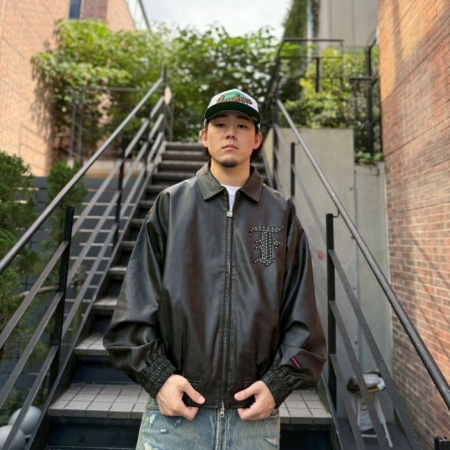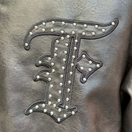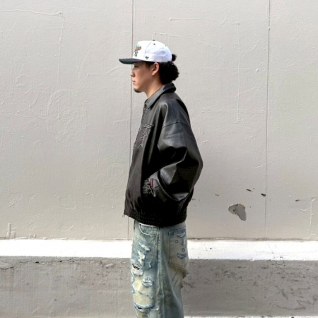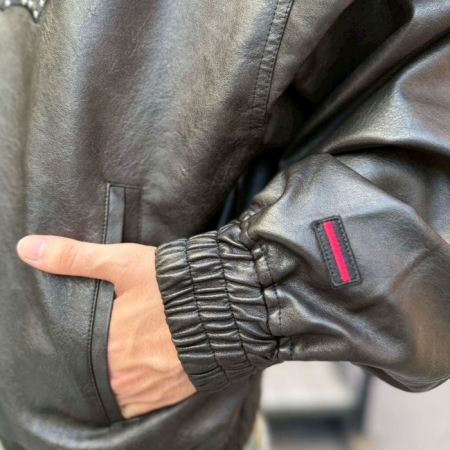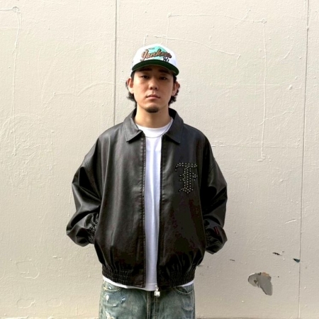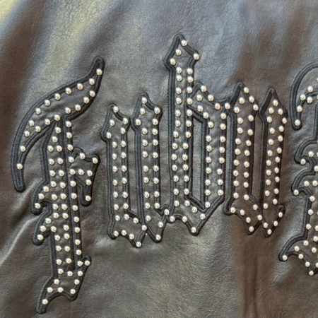 上品な光沢と耐久性を実現した高品質なフェイクレザー素材を使用したボンバージャケット。フロント・バックにスタッズをあしらったブランドロゴのパッチ刺繍がインパクト抜群。適度なビンテージ感もあり、男女共にオススメの1着です。