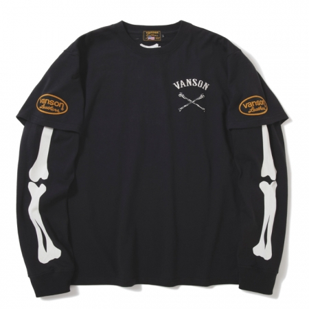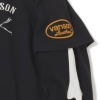 1着で重ね着をしたようなデザインのフェイクレイヤード長袖Tシャツ。アメカジらしい肉厚な天竺を使用。フロントはシンプルなクロスボーン刺繍、バックにはトレードマークのボーンを刺繍でグラフィックしたディティールとなっています。袖にもプリントとオーバルワッペンをアクセントにした、バイカーテイスト漂う力強いデザインです。