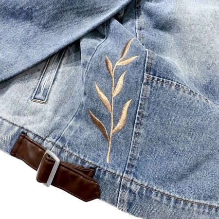 襟とフラップにはビーガンレザー(PU)を採用し、各ポケットには ZIP を装備。さらに製品加工を施し、アタリによる豊かな表情を表現しています。加えて、随所に施された刺繍もデザインのポイントとなっています。