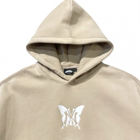 パーカフロントに NY BUTTERFLY LOGO 、右袖に ONELOVE、左袖に NEW YORK STATE OF MIND の刺繍。パンツの左右フロントに NY BUTTERFLY LOGO・NEW YORK STATE OF MIND の刺繍が入った裏起毛のスウェットセットアップ。