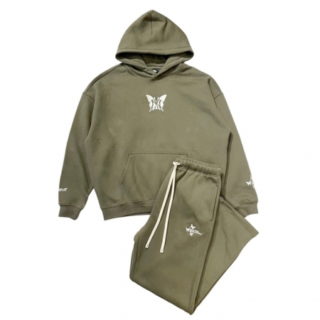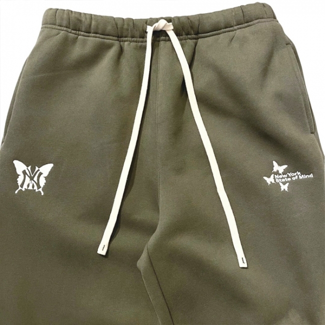 パーカフロントに NY BUTTERFLY LOGO 、右袖に ONELOVE、左袖に NEW YORK STATE OF MIND の刺繍。パンツの左右フロントに NY BUTTERFLY LOGO・NEW YORK STATE OF MIND の刺繍が入った裏起毛のスウェットセットアップ。