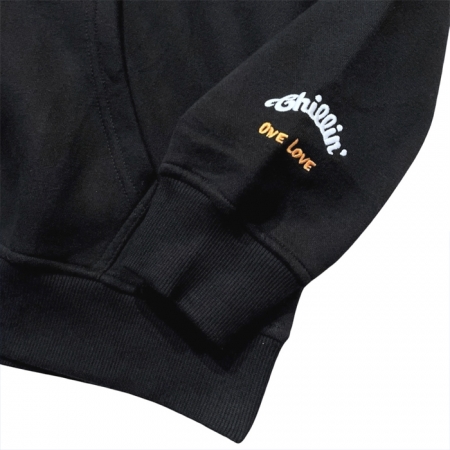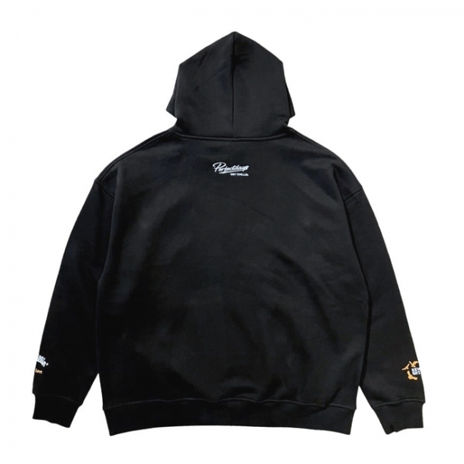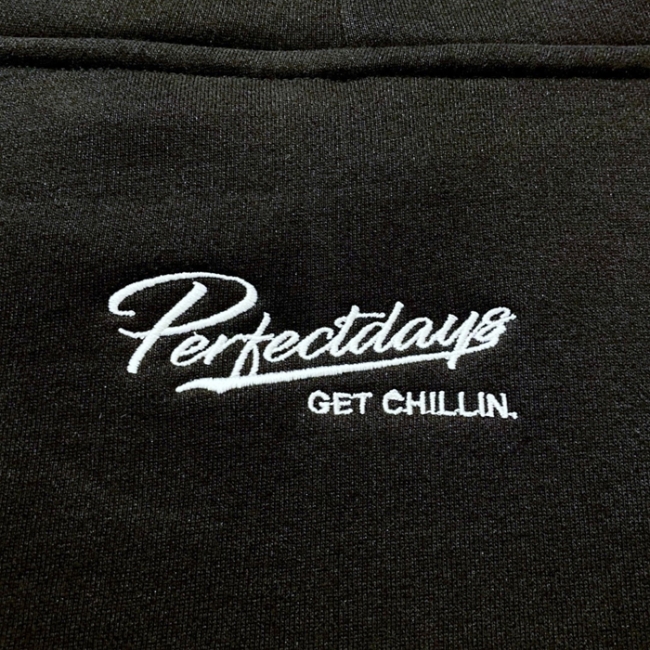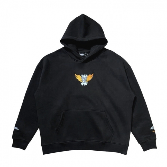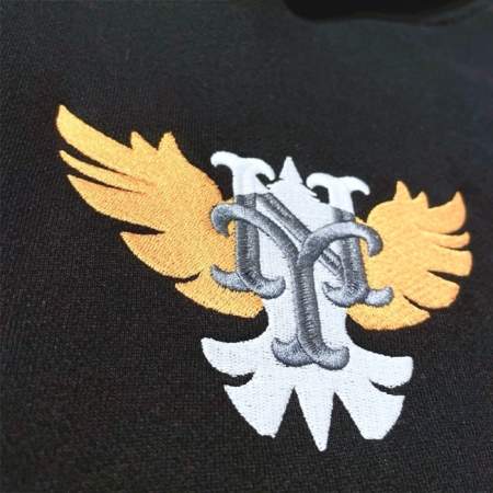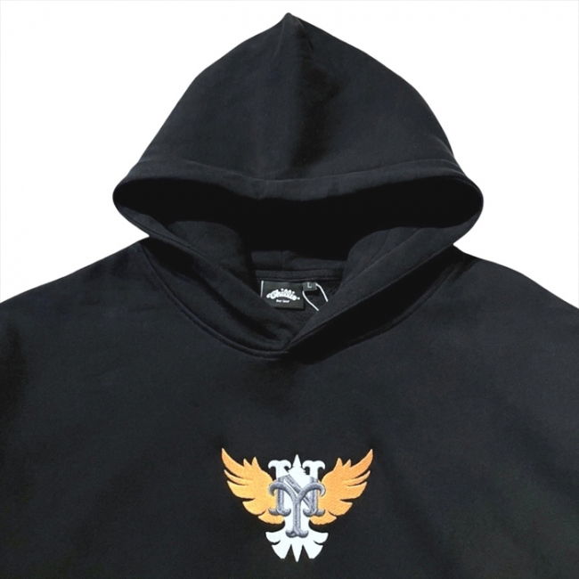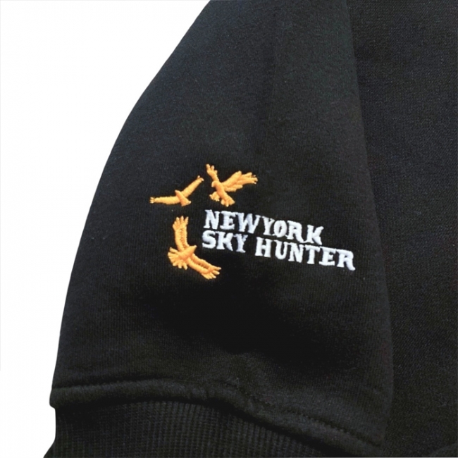 フロントにアイコンであるイーグルと NY モノグラムのミックスロゴ、右袖に NEW YORK SKY HUNTER、左袖に Chillin’ ONELOVE の刺繍。