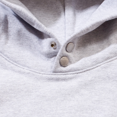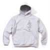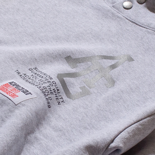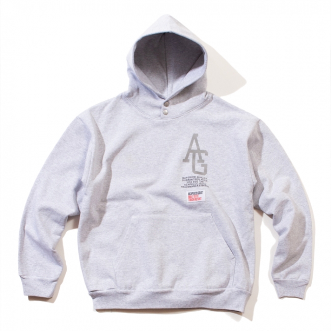 定番になりつつあるフード部分に AG オリジナルのスナップボタンが付いたザラっとしたタフな14oz のMADE IN USA ボディーに、スナップと同じ系統の色合いのリフレクターで AG ロゴが施されたクリーンな仕上りのフーディ。
