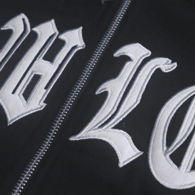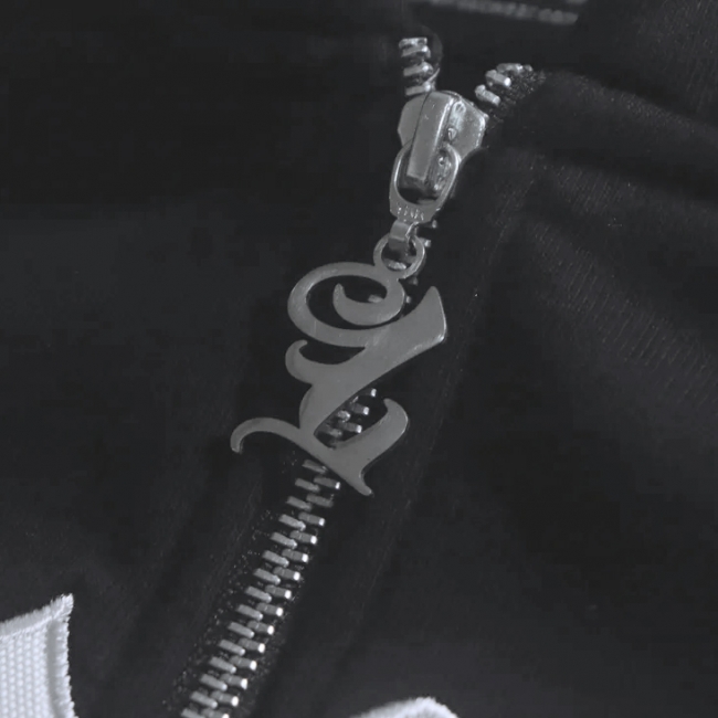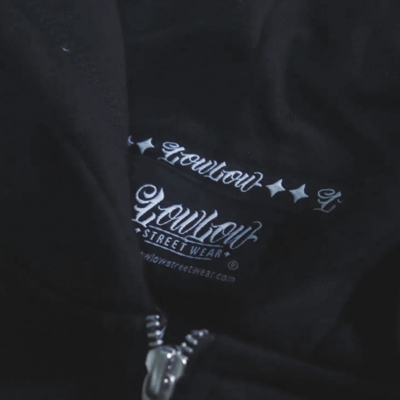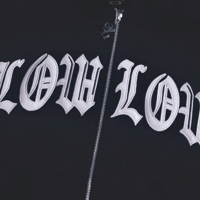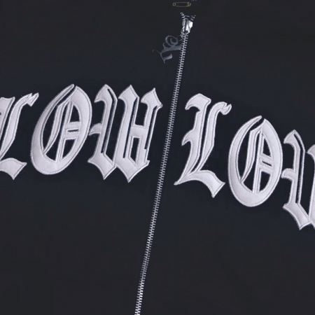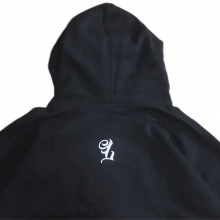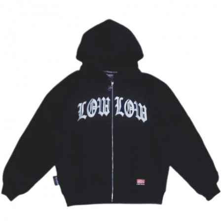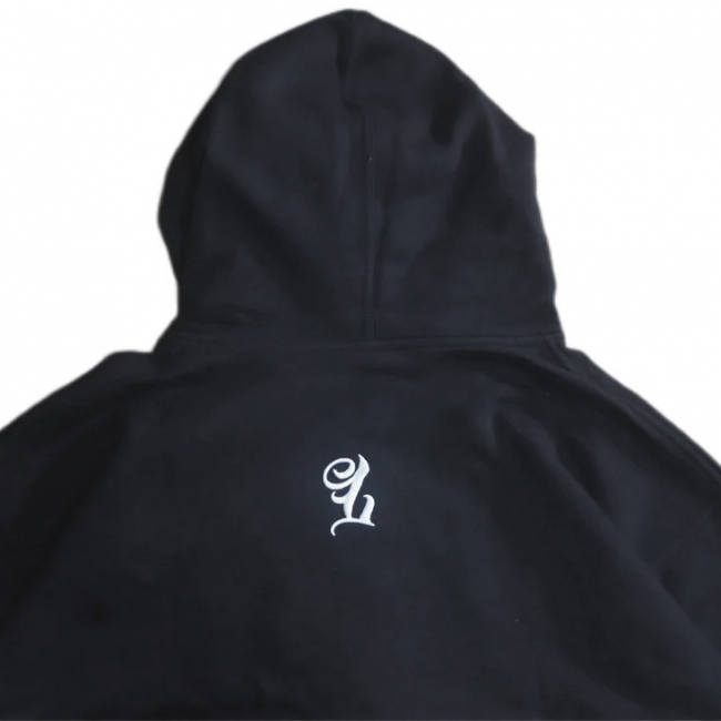 この LOWLOW フーディは 16オンスの厚手の生地を使用。フロントに LOWLOW ロゴのタックル刺繍、フーディーの後ろに L の3D刺繍。