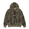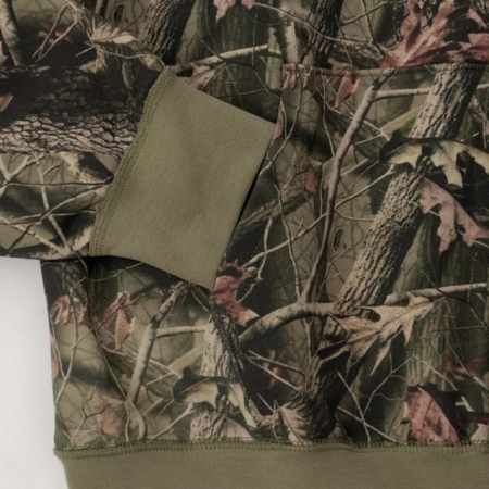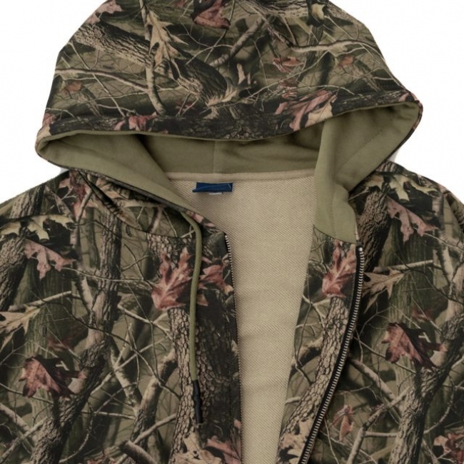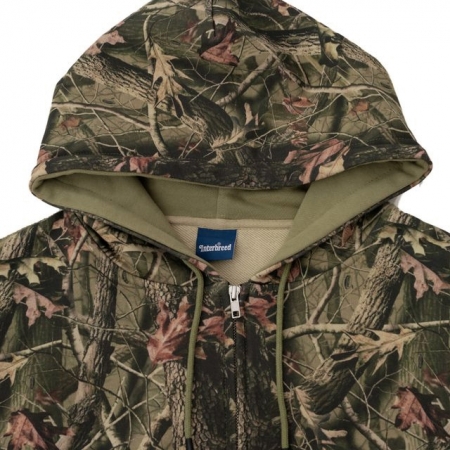 ずっしりと目の詰まった質感の14オンスコットン裏毛スウェットを使用。フロントはフルジップタイプで、Tree Camo、Rain Camo、Real Tree Camo の3カラー展開。スタイルを選ばないベーシックなシルエットで、身頃やフードのボリュームと丈感のバランスに拘ったオリジナルパターンです。フード内側とリブはソリッドカラーの切り替えとなっています。