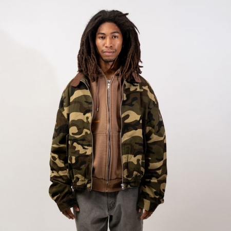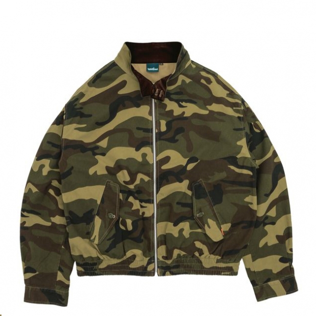 通年羽織れる肉感・仕様のアウターで、表地にはカモフラージュ柄のコットンツイル、裏地には薄手のコットンを使用しています。襟裏はコーデュロイ生地の切り替えで、G9 ジャケットをベースに丈感やディテールをアップデートしたオリジナルパターン。ベーシックなドリズラータイプながら、幅広のショート丈でトレンド感のあるシルエットです。フロントはファスナー仕様で IDEAL 製のファスナーを使用しています。