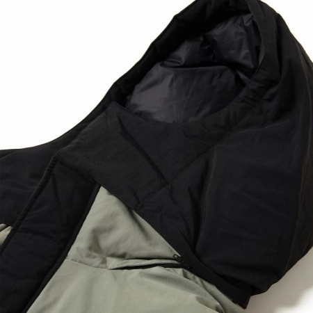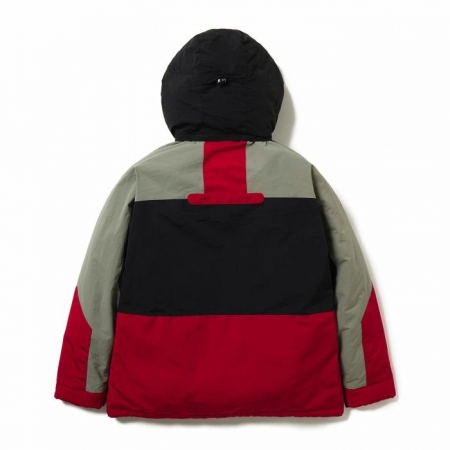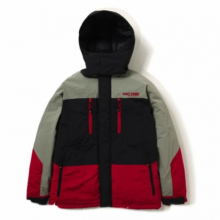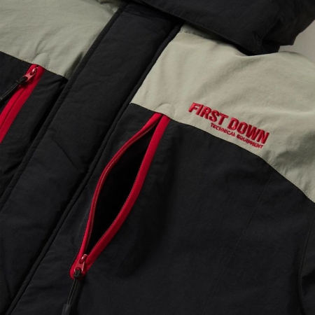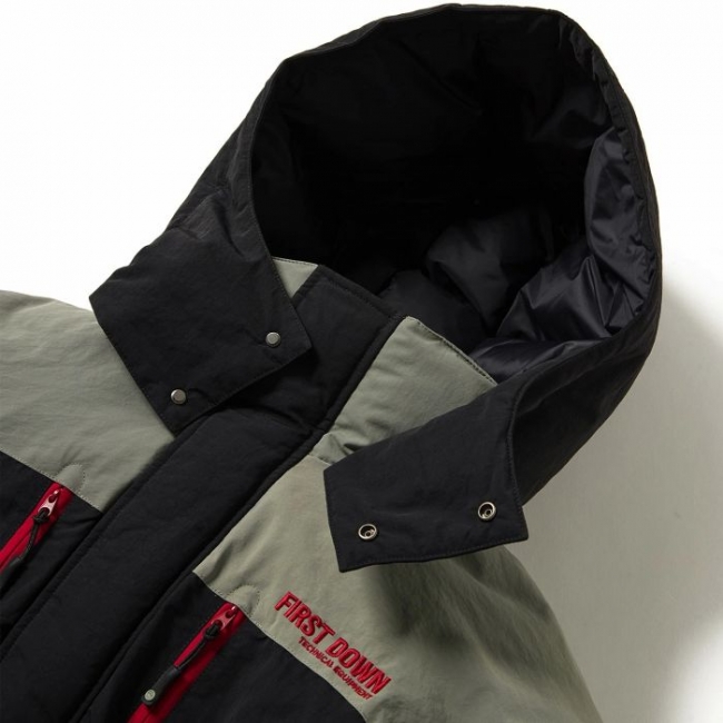 重厚感のあるマルチブロッキングデザインが目を引くフードダウンジャケット。身頃、フード、袖、カフスに至るまで配色と素材切替が施され、クラシックでありながらも現代的なストリートシルエットに昇華されています。フロントの比翼ボタン、フード脱着ZIP、立体ポケット、アジャスタブルカフスなど、機能性とデザイン性を融合した完成度の高いディテールが満載です。