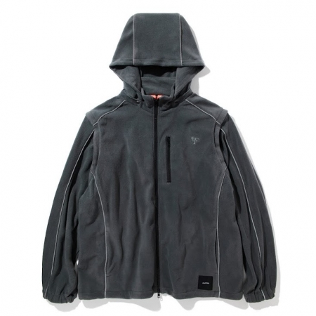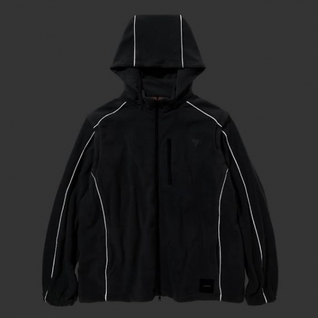 しっかりした生地感&裏地もついているので、フリース意外と風通す問題も解決。フードから走るリフレクターパイピングは袖に流れ、胸から走って同生地の Poseidon Pant に繋がります。charcoal と black はセットアップで着用可能、夜道も安心どころかめちゃ目立ちます。」