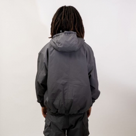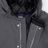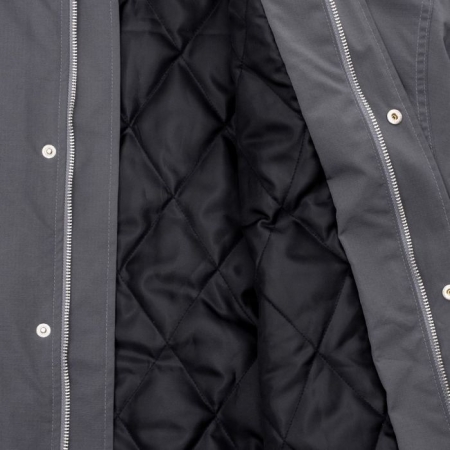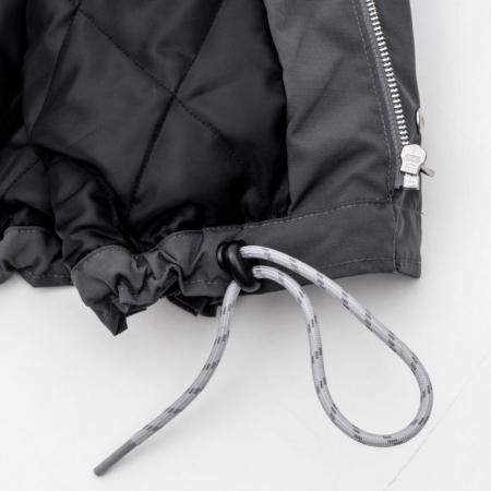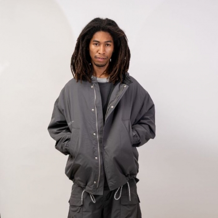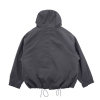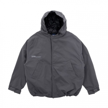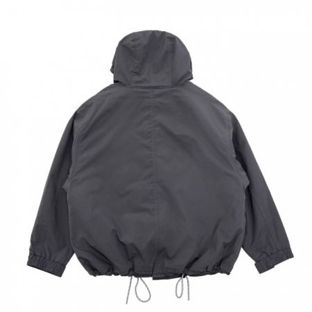 表地には撥水性を備え、軽量かつハリのあるポリエステル生地を使用。身頃とフードにのみ中綿を入れ、アーム部分の中綿は省いた仕様で、一定の防寒性は確保しつつ、腕の動作や身動きの取りやすさを考慮した造りとなっています。身頃や肩周りに適度なボリューム感を持たせ、裾のコードを絞る事でバランスの良いショートフォルムで着用頂けます。