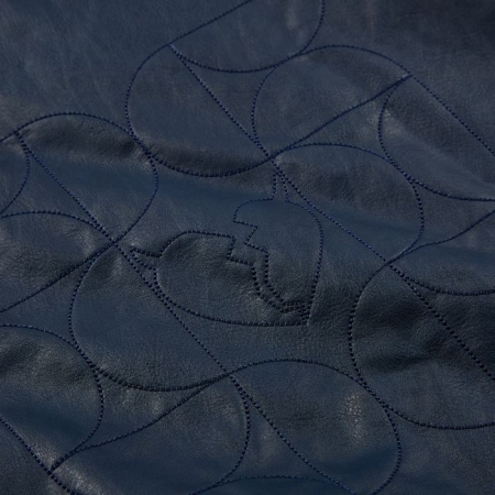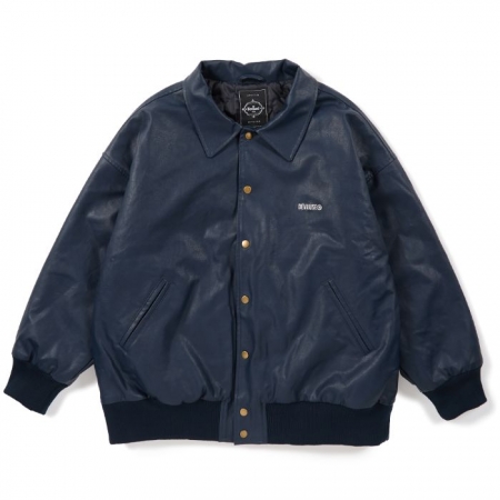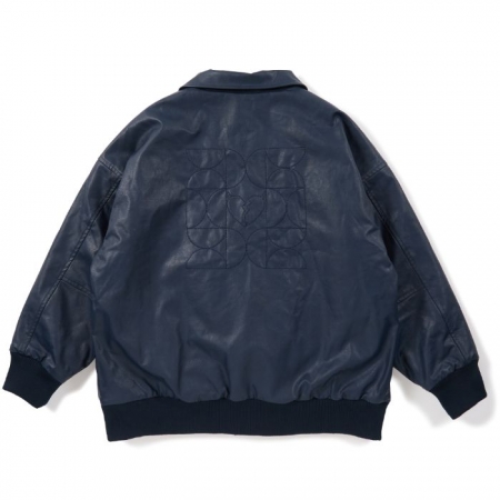 オールレザーの Varsity JKT。動物性由来のレザーは使用せず、マットな質感でほどよく柔らかい合皮を採用。フロントには小さめの刺繍と背面にはブランドアイコンのグラフィックがステッチで表現されています。