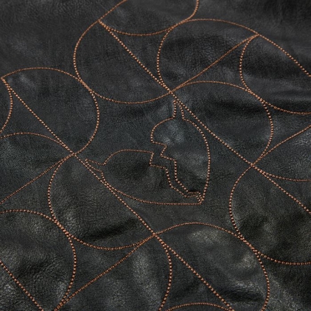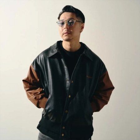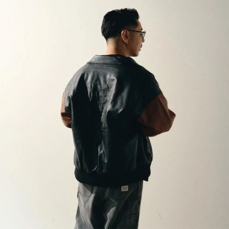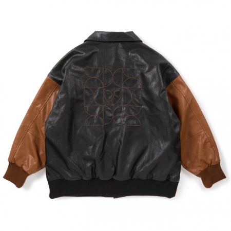 オールレザーの Varsity JKT。動物性由来のレザーは使用せず、マットな質感でほどよく柔らかい合皮を採用。フロントには小さめの刺繍と背面にはブランドアイコンのグラフィックがステッチで表現されています。