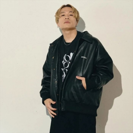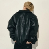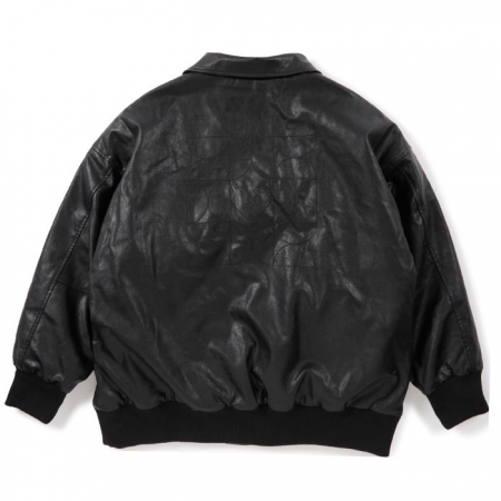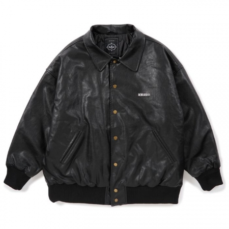 オールレザーの Varsity JKT。動物性由来のレザーは使用せず、マットな質感でほどよく柔らかい合皮を採用。フロントには小さめの刺繍と背面にはブランドアイコンのグラフィックがステッチで表現されています。
