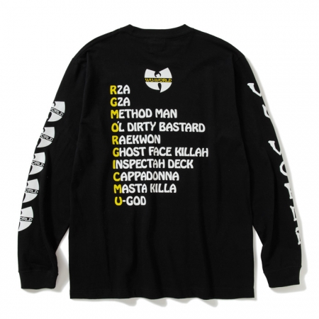 フロントに WU-WORLD ロゴ、右袖に WU-WORLD の文字、左袖に WU -WORLD の BAT ロゴ、ロゴバックにメンバーの名前がずらりと並んでプリントされたロンT です。