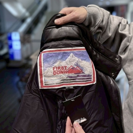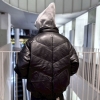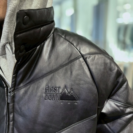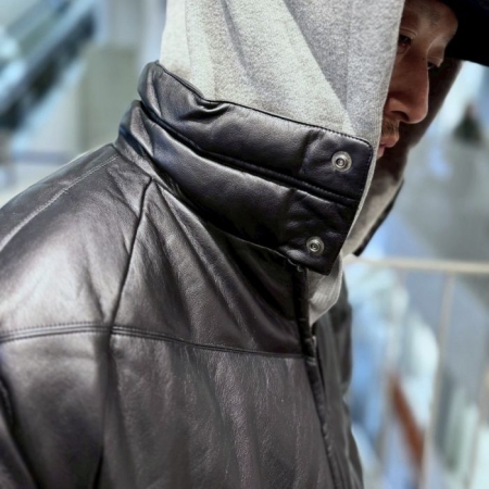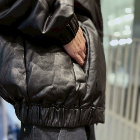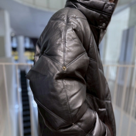 高級感あるマットな質感のフェイクレザーを使用した、V字キルトのバブルダウンジャケット。中綿には高品質といわれる700フィルパワーのダックダウンを使用。高さのある衿にはスナップボタンが施され、胸元にボディー同色のブランドロゴ刺繍。袖口・裾部分は共地のシャーリング仕様となっています。