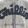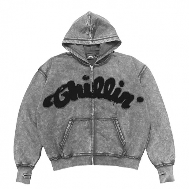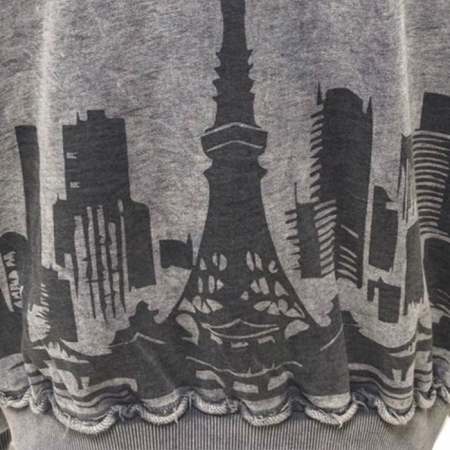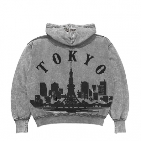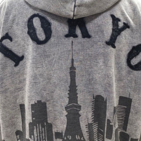 街に馴染む、リアルな一着。コンクリートジャングル漂うグレーカラー。コンクリートグリーン。フロントには Chillin’ロゴ、背中には TOKYO と東京の街並みを大胆に配置。