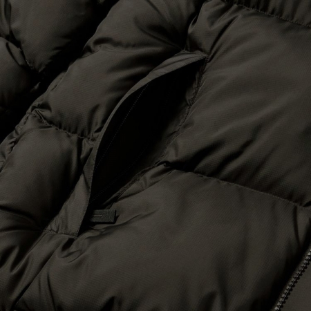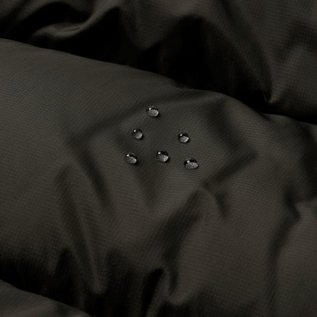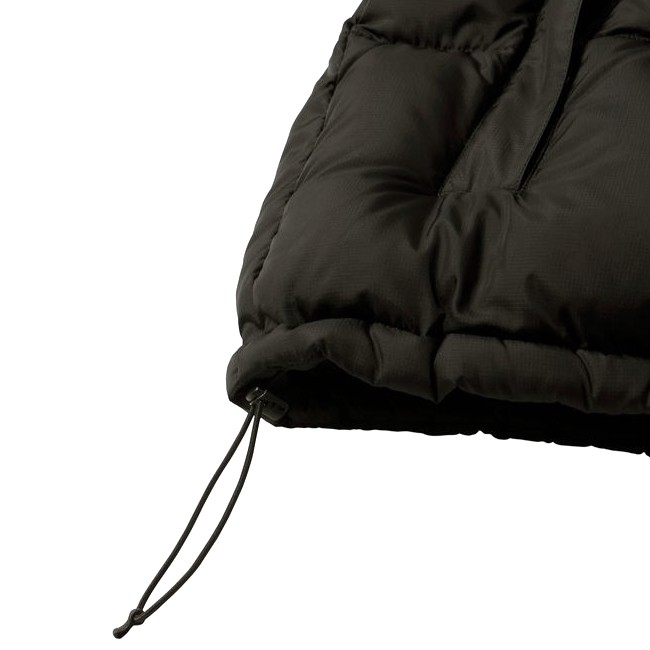 環境に配慮したリサイクルダウンを中わたの一部に使用。表地は強度がある40デニールのリップストップナイロンにはっ水加工を施し、パックに干渉する肩部分はナイロン素材で補強しています。