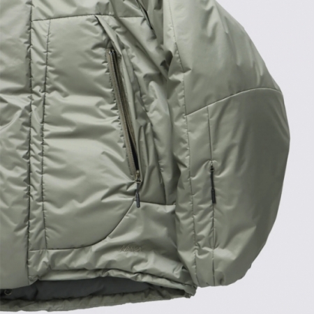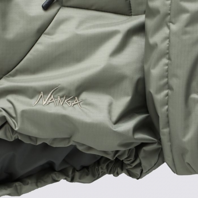 ・ダウンの弱点である水濡れに配慮した高防水性を与えながらも、透湿性を犠牲にしていない素材「AURORA-TEX(オーロラテックス)」多孔質ポリウレタン防水コーティング素材で、透湿・保温・撥水に優れた3レイヤーの高機能ナイロンで天候を気にせずに使えるので、発動の幅が広がる。リップストップなので通常のナイロンに比べ裂き強度が高くアクティブシーンで活躍。