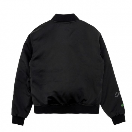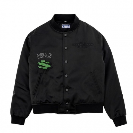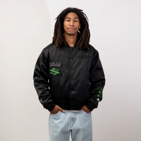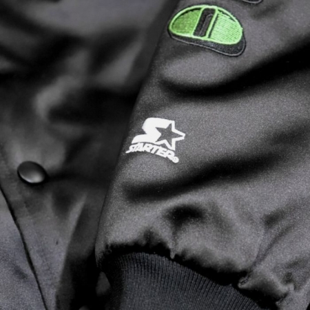 表地には高級感のある柔らかなサテン生地を使用。単色リブを合わせたオールブラックカラーで、裏はキルティングの中綿仕様。左胸/右前身頃/両袖にはそれぞれマネーモチーフの刺繍、左袖口には STARTER ロゴが刺繍で入っています。80年代後半〜90年代前半の STARTER ジャケットをイメージした、丸みのあるボリューム感とショート丈が特徴のオールドスクールなシルエット。製品にはコラボレーションタグが付属します。