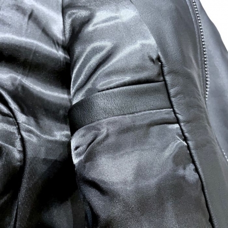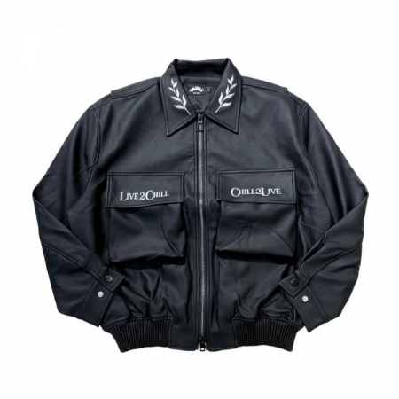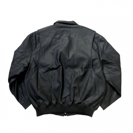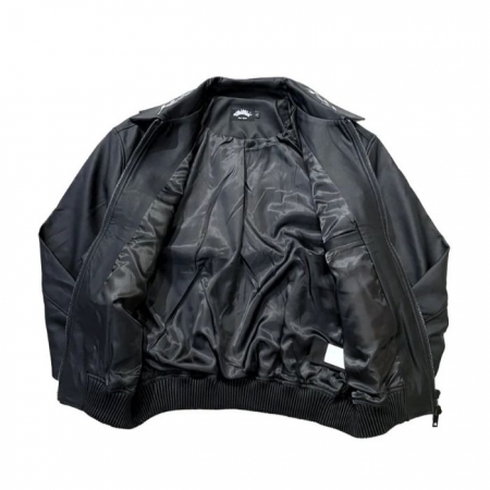 肉厚な P.U レザーを使用したボンバージャケットです。短めの着丈と適度な身幅のボックスタイプのシルエットで、フロントの大きなポケットやバックのアクションプリーツが特徴的なデザインとなっています。襟にはリーフモチーフ、ポケット部分にはロゴの刺繍入り。裏地にはライナーを備え、内ポケットも完備しています。