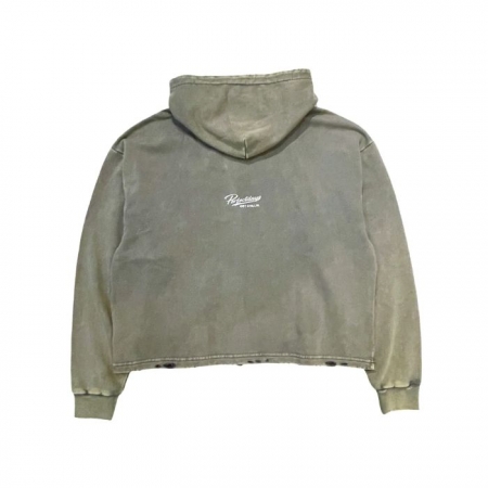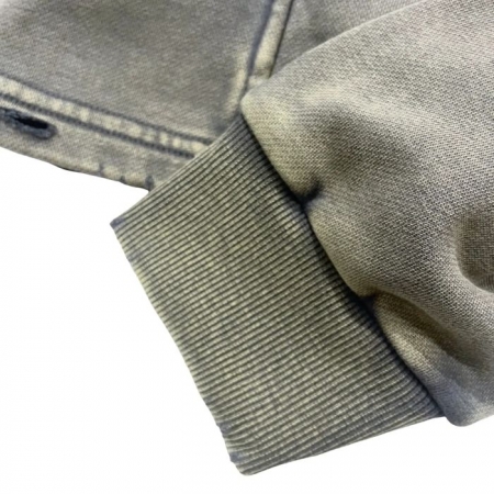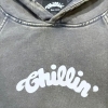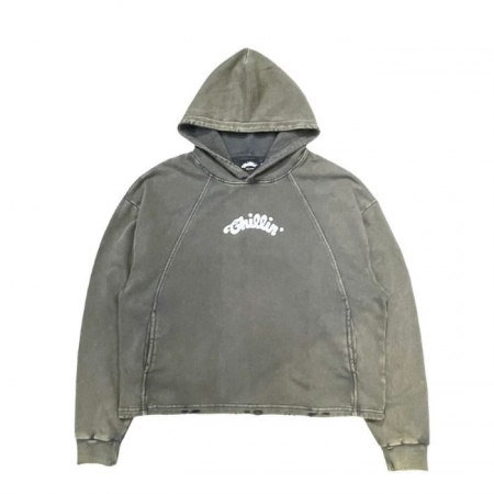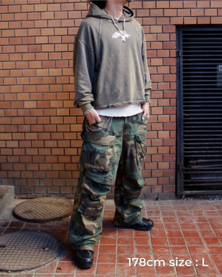 WASH 加工を施し、ダメージを加えたクロップド丈のフーディーです。フロントは CHILLIN のBIG ロゴのプリント、裾の折り返し部分にはダメージ加工が施されています。フロントの切り替えデザインが特徴で、両サイドにはポケットも完備。身幅は広め、着丈は短めのシルエットで、ジャケットのインナーや春先の一枚着としてもお楽しみいただけます。また、レイヤードスタイルにも適した、汎用性の高い一枚です。