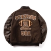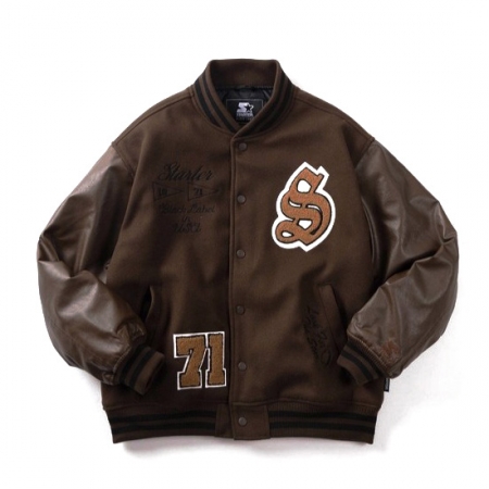 フェイクメルトンのボディにフェイクレザーの袖を切り替えた、トラディショナルなディテールのスタジアムジャンパーです。STARTER らしいストリート感あふれるデザインで、袖と裾にライン入りリブが施され、シルエットを引き締めると同時にスポーティな印象を与えます。フロントには「71」や「Starter」ロゴの刺繍が入り、背面には フットボールと「Starter 71 Champions USA」のグラフィックが大胆にサガラ刺繍で施されています。全身に刺繍・アップリケを施した高級感のあるデザインとなっています。