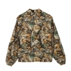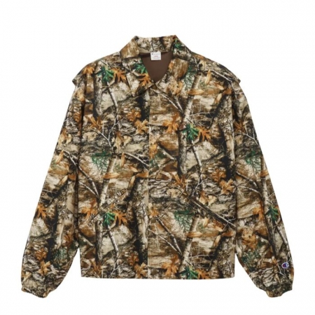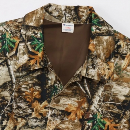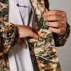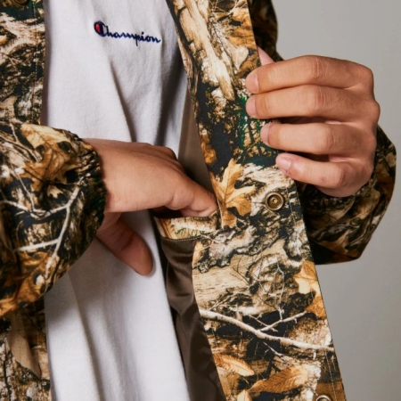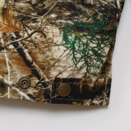 耐久性の高いコットンリップストップ素材を使用したスナップジャケットです。表地に Real Tree Camo 柄をプリント。オフブラック色はモノトーンカラーに落とし込むことで主張を抑えめにしています。背中にアクションプリーツを入れて腕の可動性を向上。両裾脇のスナップボタンによりサイズ調節可能です。脱ぎ着をスムーズにするポリエステルのライニング付き。左胸にCロゴのワンポイント刺繍入りで、ドットボタンにCロゴの刻印入り。同素材を使用したロングパンツ(C3-D207)も展開しています。