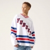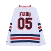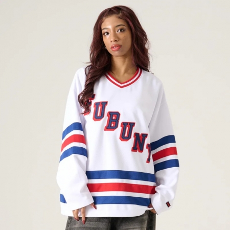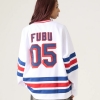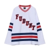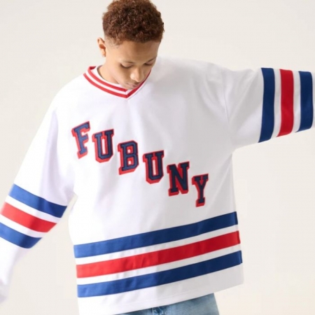 アイスホッケーのユニフォームをモチーフにした、VネックのロングスリーブTシャツです。フロントには斜めに配置された「FUBU NY」のチームロゴのアップリケ。バックには、インパクトのある「05」のナンバリングと「FUBU」ロゴを配置しています。袖や裾にはライン入りの配色切り替えデザイン。アメカジやストリートスタイルに欠かせない要素を取り入れています。
