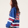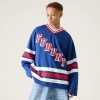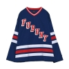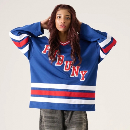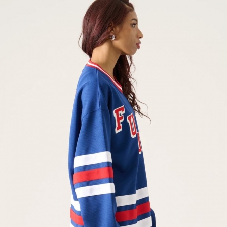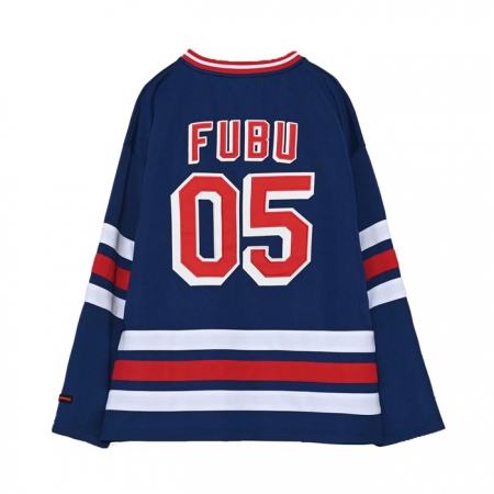 アイスホッケーのユニフォームをモチーフにした、VネックのロングスリーブTシャツです。フロントには斜めに配置された「FUBU NY」のチームロゴのアップリケ。バックには、インパクトのある「05」のナンバリングと「FUBU」ロゴを配置しています。袖や裾にはライン入りの配色切り替えデザイン。アメカジやストリートスタイルに欠かせない要素を取り入れています。
