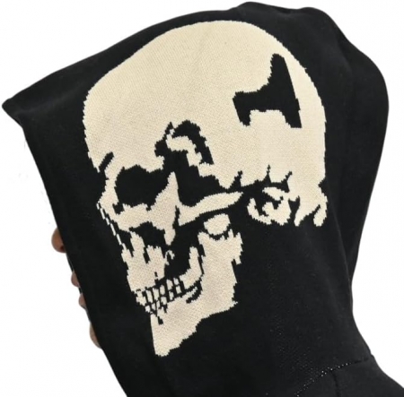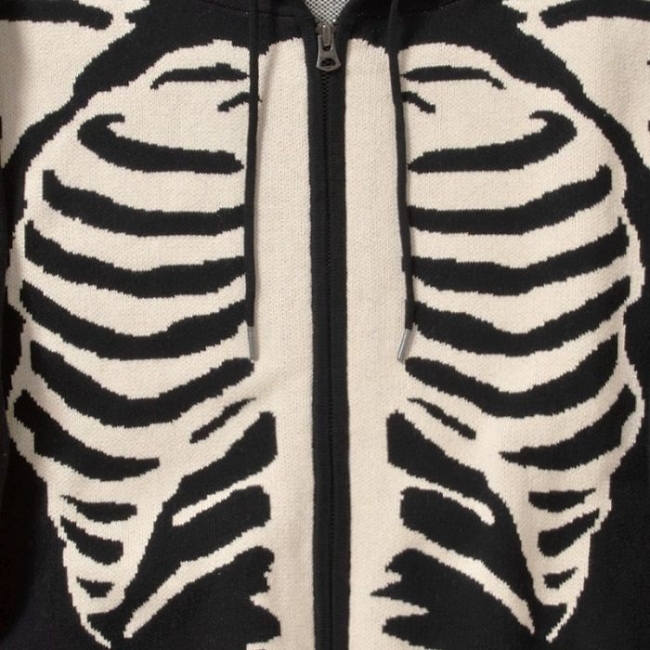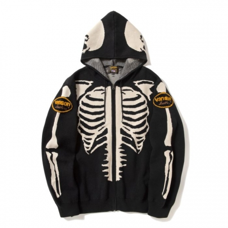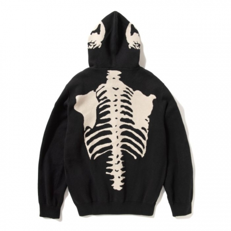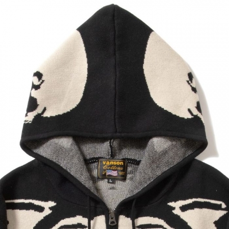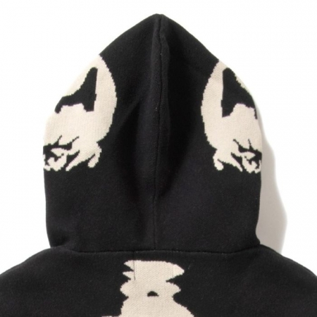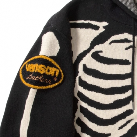 ミディアムゲージのコットン素材のニットパーカ。レザージャケットでお馴染みのスケルトン ボーン(骨)パターンが全身に編み込まれています。両腕に オーバルロボのサガラワッペン付き。