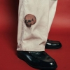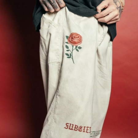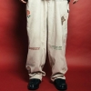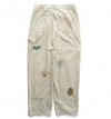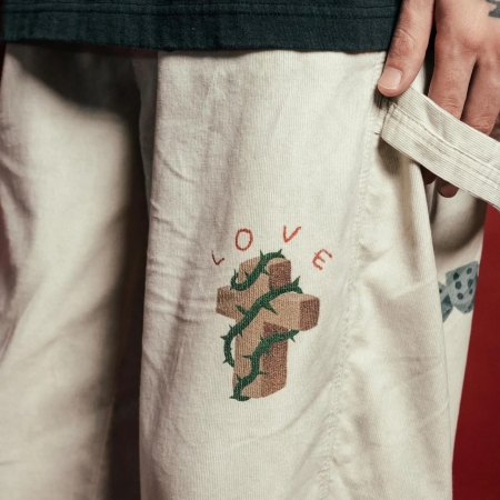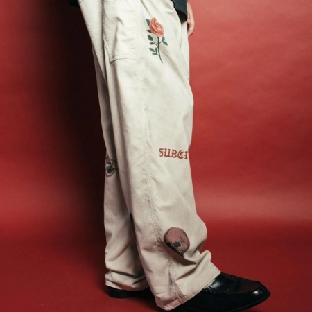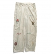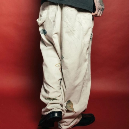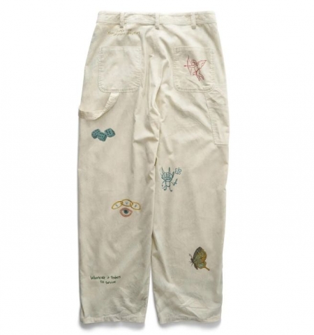「21wの細畝コーデュロイ生地を採用したカーペンターパンツ。起毛のかかった柔らかな風合いが特徴。卒業記念の寄せ書きであるメモリアルジャケットから着想を得たグラフィックを全体にプリントで施しました。汚し加工、ウォッシュ加工を施したヴィンテージのような雰囲気が魅力。」